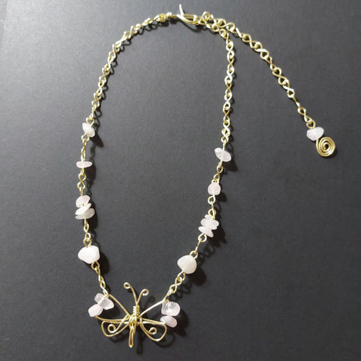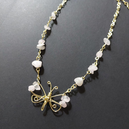 Collier composé de maillons et fermoir en cuivre au revêtement couleur or/champagne, ravissant papillon façonnés par mes soins. Perles/chips de  quartz rose