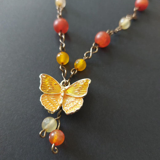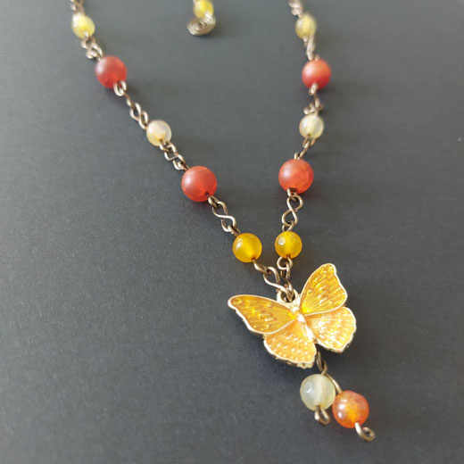 Collier composé d'un pendentif en métal couleur dorée, émaillage orange, formant un magnifique papillon. Maillons et fermoir en cuivre au revêtement couleur bronze, façonnés par mes soins. Perles d' agates orange craquelées de 8 mm et agates facettées jaunes et oranges de 6 mm de diamètre.