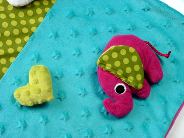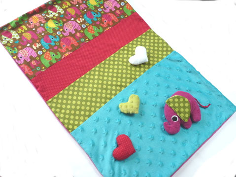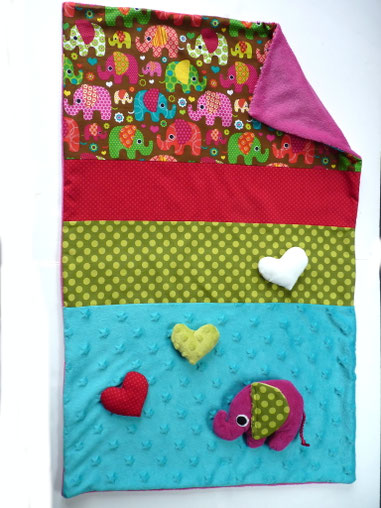 couverture, que bébé pourra facilement manipuler pour s'amuser. Les coeurs sont ouatinés et cousus à la couverture, donnant une impression de relief, avec lesquels bébé pourra jouer. Verso de la