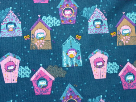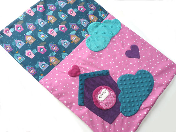 ou pour lui couvrir les jambes lors de balade en poussette.. Mignonne comme tout avec son hibou ( coton rose impression écailles, velours blanc cassé), dormant dans son nichoir (velours bleu