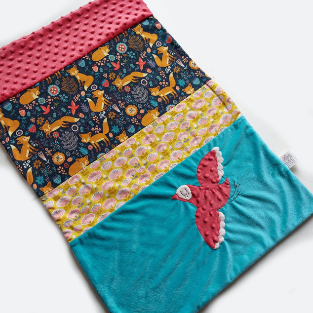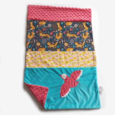 Magnifique couverture à mettre sur un couffin, son petit format se glisse partout, très pratique pour emmitoufler bébé ou pour lui couvrir les jambes lors de balade en poussette. Mignonne comme