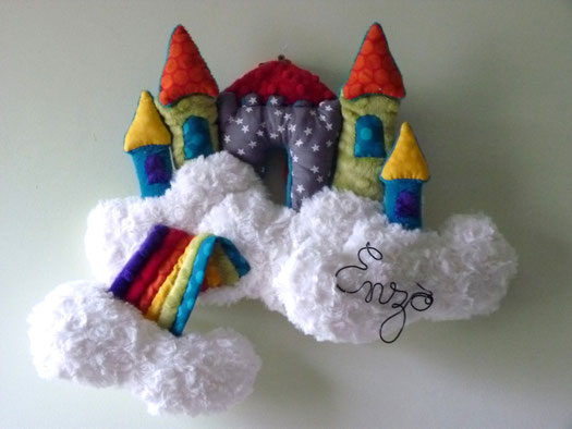 Mobile à suspendre au mur de la chambre de bébé grâce à des liens composés de ruban rouge à pois blancs à nouer. Enchanteur avec ses couleurs arc en ciel et sa pluie d'étoiles! ce mobile est principalement conçu en tissu. Les éléments sont garnis de ouatines. Le prénom est réalisé en fil de cuivre recouvert d'un revêtement noir mais est en option si vous n'en souhaitez pas. Son ajout est gratuit, il suffira juste de me préciser le nom de l'enfant.