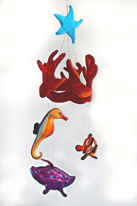 Mobile marin, corail, hippocampe, étoile de mer, poisson clown, raie manta, fait main l'Arche de Jessica, en laine feutrée et piquetée