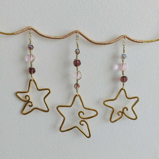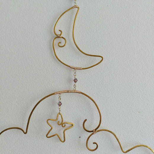 Ravissant mobile aux doux reflets lumineux, pour égayer la chambre de votre petite princesse ! Il est composé de fil d'aluminium au revêtement doré que j'ai martelé, pour lui donner ses formes de nuage, de lune et d'étoiles. Différentes perles de verres roses /violettes, les une transparentes, rondes ou bien facettées, aux reflets dorés, apporte une belle touche girly et lumineuse.