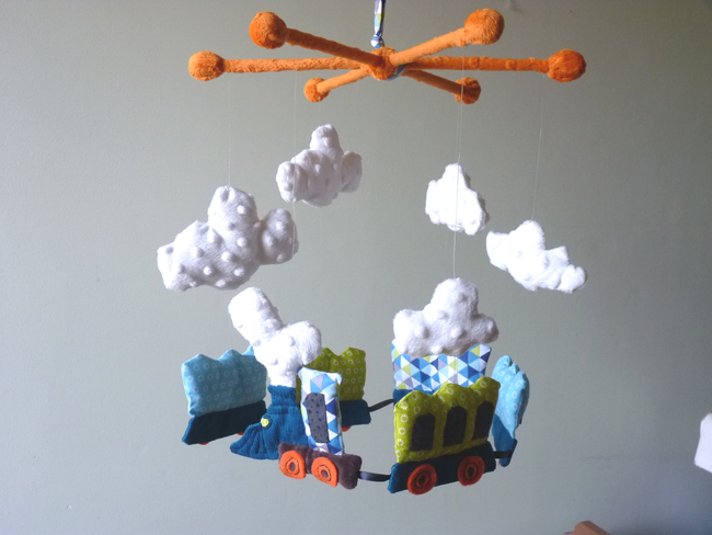 Adorable mobile figurant un train et ses wagons parmi les nuages . Le train est composé de tissu coton imprimé design scandinave, turquoise gris et vert, de velours aux pois gaufrés blanc et orange, velours milleraies turquoise. Les roues sont en feutrine orange. Rembourrage en ouatine. Les sujets sont reliés à un support à six branches en bois (recouvert de velours orange) grâce à du fil de nylon transparent. Mobile à suspendre à une potence ou à-même le plafond (en prenant soin de le mettre hors de la portée de bébé!) grâce à deux liens.