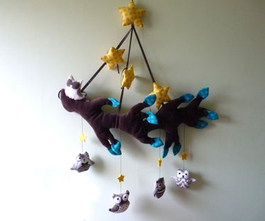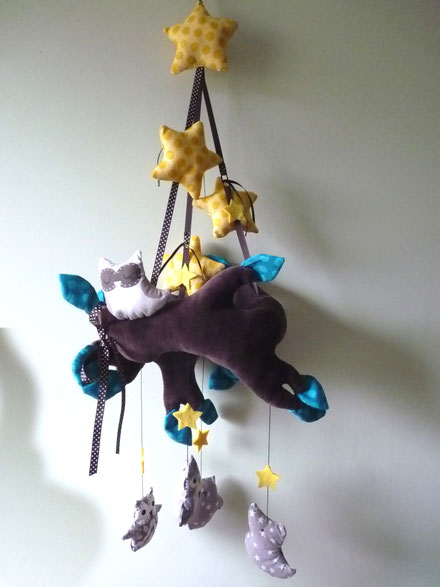Charmant mobile,, en tissu garni de ouatine représentant un hiboux endormi sur une branche, surmontée de quatre étoiles jaunes, en compagnie de quatre autres hiboux volant en dessous de la branche. Ces éléments sont reliés entre eux grâce à du fil noir de coton ciré relativement épais et solide ainsi que du ruban chocolat à pois blancs. Ce mobile peut être fixé au mur ou à un arceau ( l'arceau étant un plus pour que le mobile puisse tourner sur lui-même). Le mobile peut soit être en position mobile/ cercle en nouant deux liens de ruban satiné chocolat ou bien à plat contre le mur en dénouant les liens: vous pourrez ainsi jouer sur deux façons de positionner, au grès de vos envies. Ce mobile n'étant pas un jouer, il faut le maintenir hors de la portée de bébé;