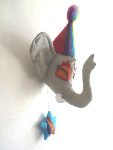 Ce trophée figure une tête d'éléphant réalisé avec du lin gris clair. Les défenses sont en velours blanc ras. le chapeau est conçu avec de la laine feutrée, ainsi que l'arc sur l'étoile bleue ( velours ras bleu ouatiné ), raccordé au trophée par du fil noir.