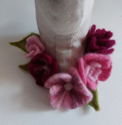 Les fleurs sont en laine que j'ai délicatement feutréf, rose poudré et framboise, celle du centre est piquetée de fil de soie. Les feuilles sont en laine vert pomme.