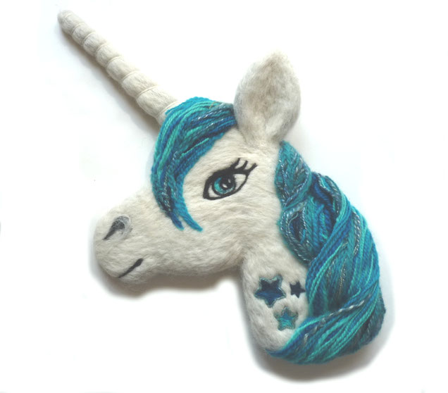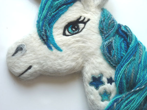Rembourrage en laine . Réalisé avec la technique du feutrage à l'aiguille, chaque éléments de cette licorne sont naturelles! Cette applique décorera avec goût et fantaisie la chambre de bébé ou