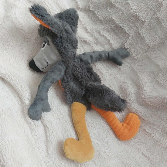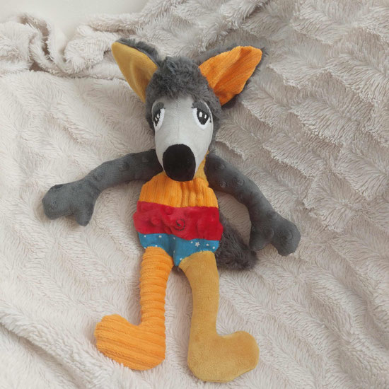 Adorable doudou loup, ultra doux! Son corps, plat, est facile à saisir par bébé ! Trop chou avec sa grosse truffe (velours noir), tendre avec son sourire (cousu avec du fil à brodé noir). Il sera un compagnon de choix pour bébé et saura cajoler, avec ses tissus doux ( tissu à poile long gris, soyeux ) et l'émerveiller par la richesse de ses textures et par ses couleurs diverses ( velours jaune moutarde ras, velours gris côtelé, velours orange côtelé ) et vive, le rouge ( velours à pois gaufrés )étant une des couleurs que bébé perçoit et affectionne en premier ! Pour une nuit rêveuse, coton bleu avec pluie d'étoiles blanches. Têtes, pâtes, queue rembourrées avec de la ouatine.