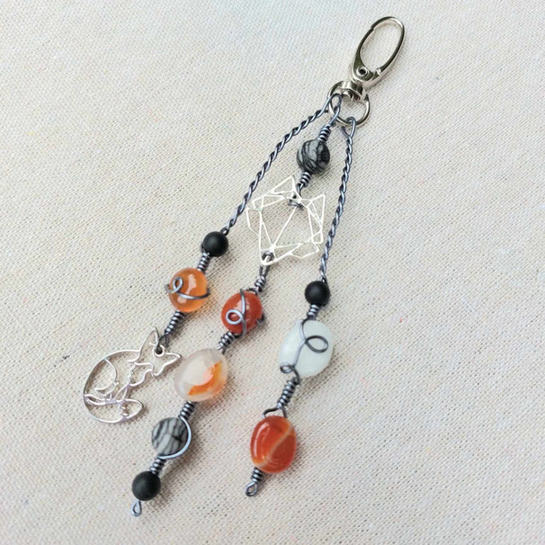 Ces apprêts ont reliés avec du fil de cuivre au revêtement couleur graphite que j'ai délicatement torsadé pour les fixer à un mousqueton de métal argenté que vous pourrez attacher à l'anse de votre sac ou selon votre désir.