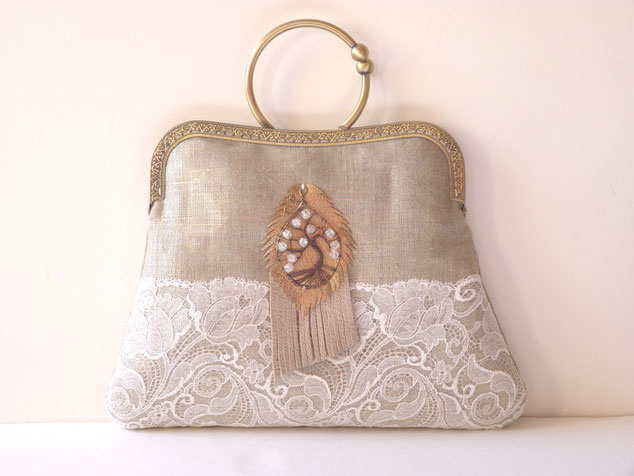 transparent et facetté . Plume en cuir de chèvre doré, frange en cuir doré. Lin naturel lamé or, matière noble, aux beaux reflets lumineux. Intérieur en tissu blanc cassé matelassé. Ce sac