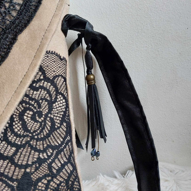 Belle pochette avec rabat, romantique et féminine avec sa dentelle de Calais noire aux motifs fleuris, mais surtout sa magnifique guipure noire formant un papillon aux jolies arabesques! Incroyablement douce avec son tissu en suédine velouté, taupe claire/beige