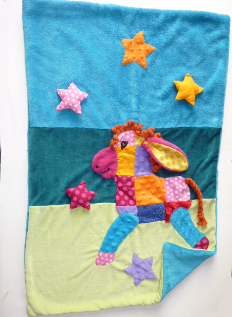 Magnifique couverture à mettre sur un couffin, son petit format se glisse partout, très pratique pour emmitoufler bébé dans son berceau ou pour lui couvrir les jambes lors de balade en poussette !!! Mignonne comme tout avec sa petite ânesse à la robe multicolore. Cette couverture mêle différentes texture telles que le velours ( bleu, vert pomme), , tissu doudou turquoise et laine orange (crinière et queue), et les motifs: étoiles ( coton avec étoiles rose,petits pois, pour le plaisir des yeux et du toucher, bien chaud et confortable. Certains éléments comme la crinière, la queue et l'oreilles et deux étoiles (rembourrées), sortent de la couverture comme un véritable doudou et peuvent être manipulés par bébé: cette couverture, en plus d'être un accessoire utile pour le couvrir, éveillera ses sens!