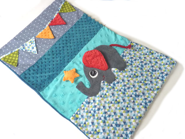 ou pour lui couvrir les jambes lors de balade en poussette. Originale avec son éléphant gris (tissu doudou gris, oreille en velours gaufré rouge), jouant avec une étoile avec coussinet pouet